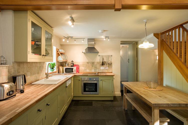 Recently converted, this lovely stone holiday cottage offers spacious accommodation. The lounge and kitchen are open-plan: relax in the double height living room which is kept cosy on cooler days with under-floor heating and a gas “wood burning” stove. On warmer days, French windows can be opened out into Ty Coed’s enclosed garden. Cooking is a pleasure in the traditional hand-crafted fitted kitchen, which is well equipped for home cooking. Ty Coed’s utility room and modern bathroom both lead off the kitchen.