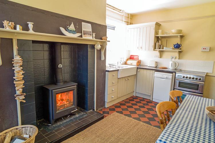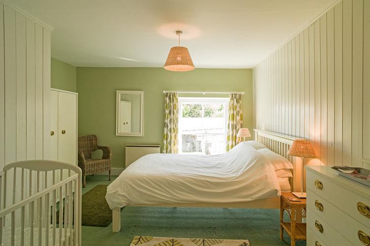 Upstairs are two roomy bedrooms. The double bedroom has a king-sized bed and a wooden cot. The triple bedded room has three single beds. Both rooms have views over Plas Lligwy’s farmyard, beyond to fields and towards the sea.